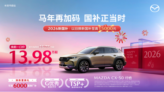 MAZDA CX-50全系,则延续了马自达在宽体SUV领域的优秀表现,完美结合城市与户外的多元需求。CX-50以其宽敞舒适的空间、强劲动力和丰富科技配置,引领家庭用户的出行新风潮。为了迎接新春的到来,长安马自达推出了特别的购车优惠政策: